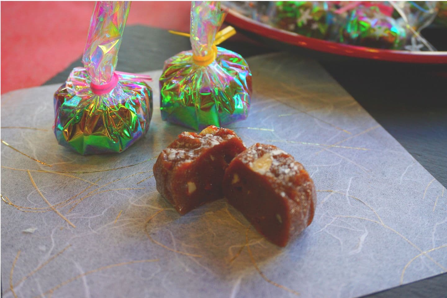 キャラメルの奥深い甘みと刻んだアーモンド風味を堪能できるゆべし。食べやすく子どもたちに人気のお菓子です。