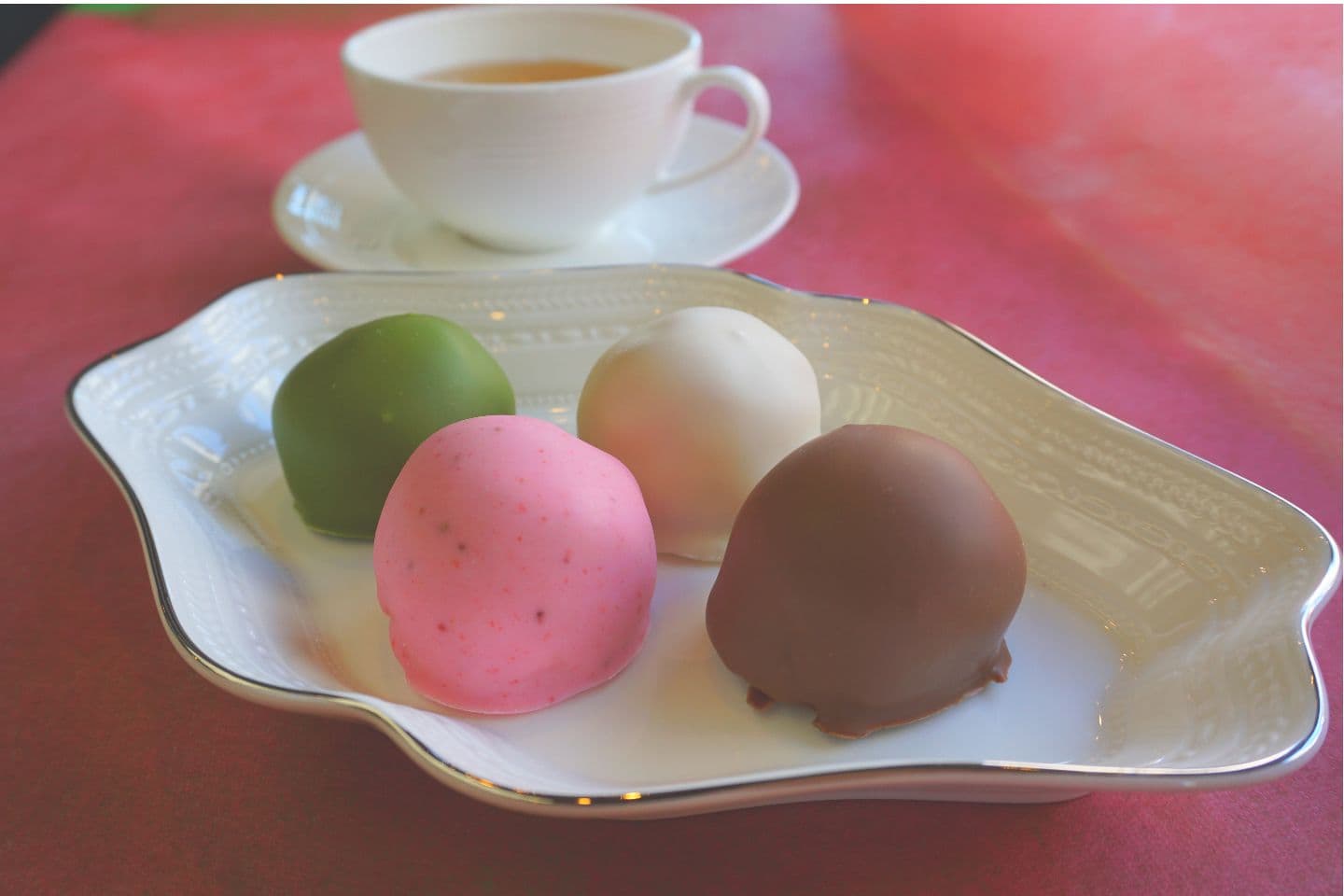 果実餡にホワイトチョコレートを包んだフルーティーな洋風和菓子。スイート、ストロベリー、抹茶の4種類、和と洋のハーモニーが美味。日本茶やコーヒー、紅茶にもマッチ。冷凍保存でいつまでも作りたての味が頂けます。