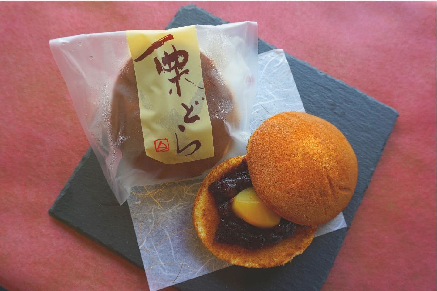 丸々と栗が入った定番のどら焼き。餡が栗のおいしさを引き立たせるように丁寧につくっています。